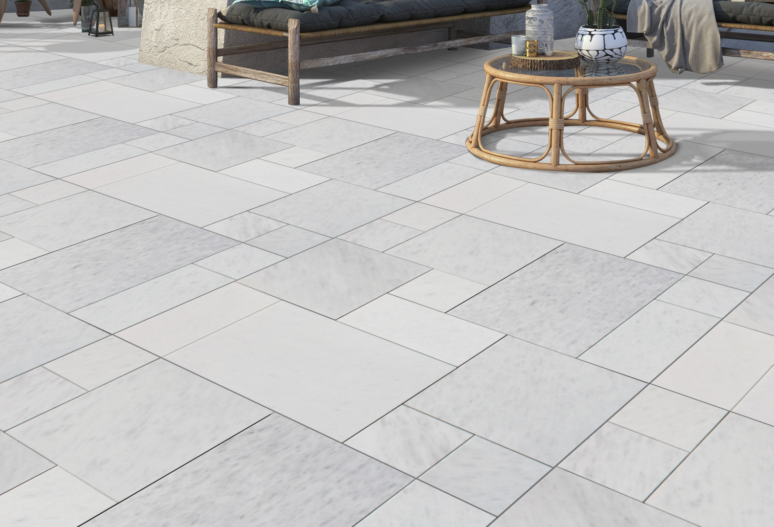 Bianco Marble pavers are sandblasted and tumbled to create a smooth, yet slip-resistant finish with elegant veining and unique colourations. They are ideal for pool surrounds, patios, courtyards, pathways, stepping stones and entertaining areas.
