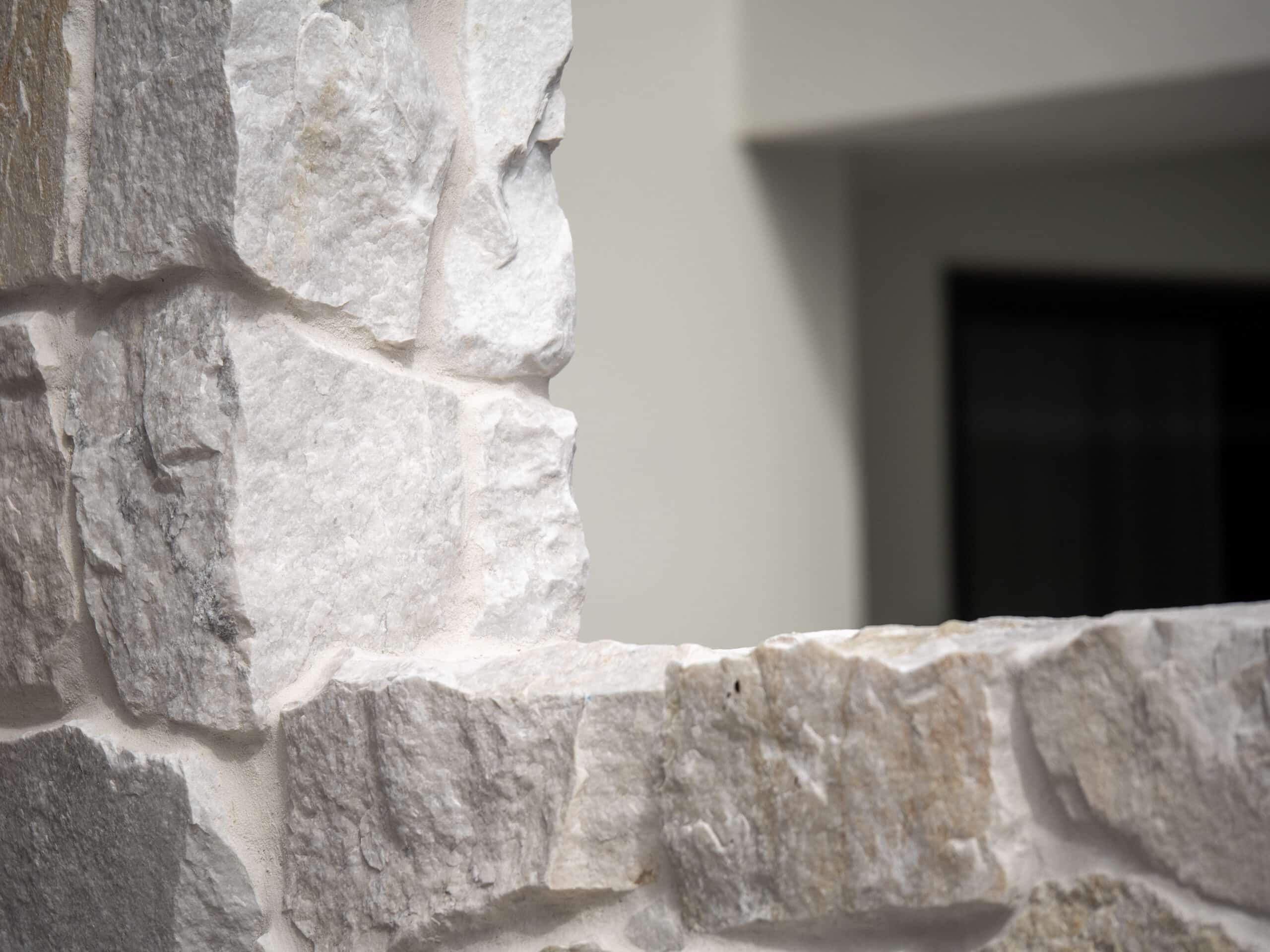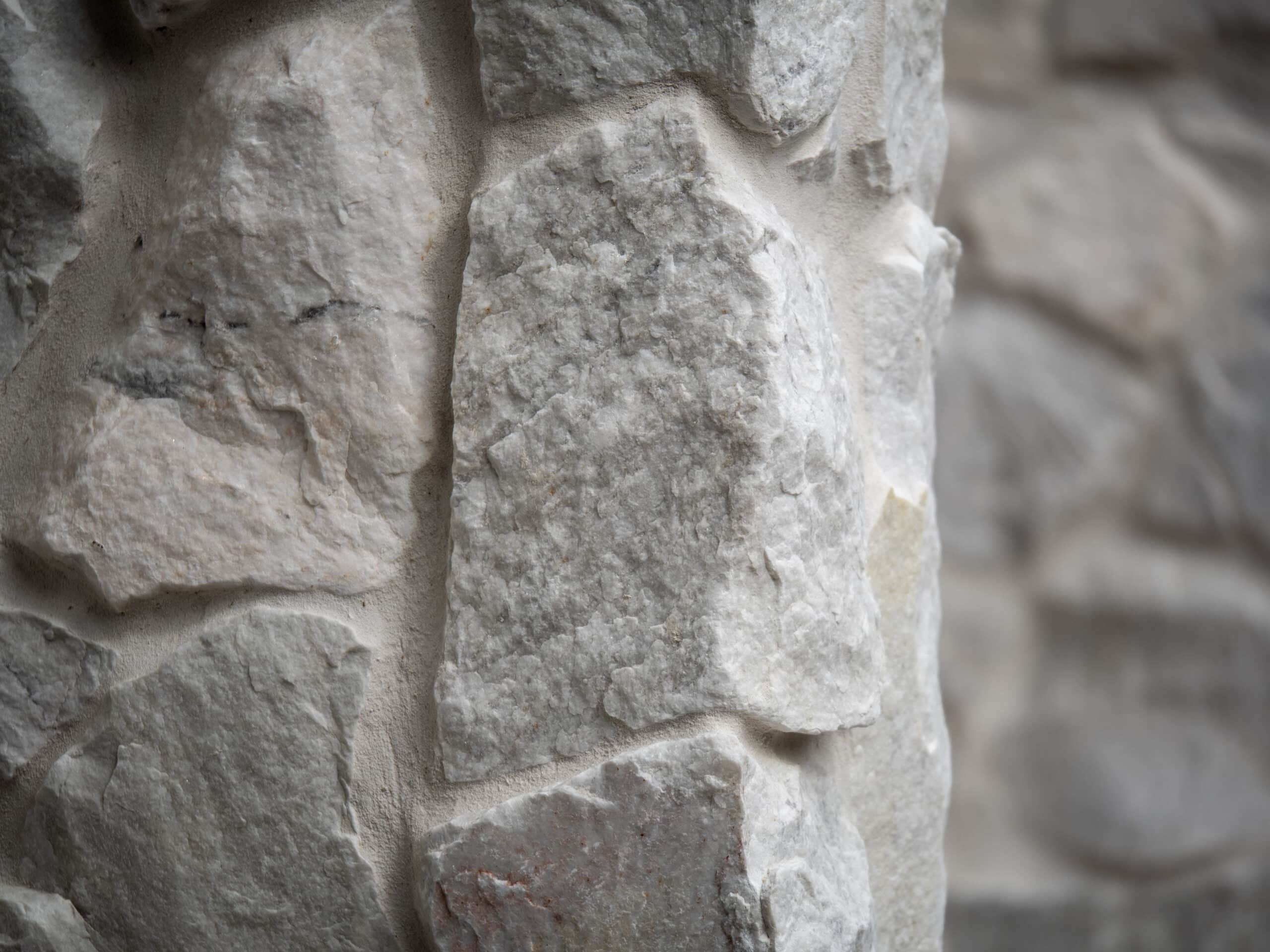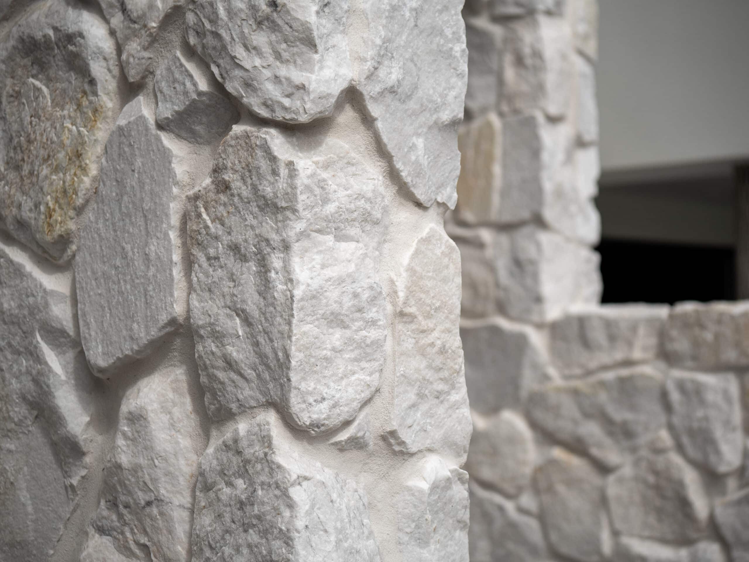 Our free form natural stone cladding incorporates stone pieces with split surfaces and chipped edges to create a stone wall finish with a multifaceted, textured appearance.