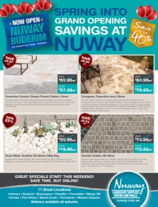 SPRING INTO NUWAY SAVINGS AT GRAND OPENING GREAT SPECIALS START THIS WEEKEND! SAVE TIME, BUY ONLINE! Ashmore • Buderim • Burpengary • Chandler • Forestdale • Mango Hill Ormeau • Pine Rivers • Slacks Creek • Thornlands • Western Suburbs 11 Great Locations Delivery available all suburbs Tumbled White Quartz Pebble. Has a natural reflective fleck. Perfect product to brighten up any outdoor/indoor space. Also available in 30-50mm & 50-80mm size. Snow White Tumbled 20-30mm 20kg Bag Granite cobble paving mats are a fantastic garden paving solution that makes laying a patio, pathway or driveway much simpler. Our cobble mats offer traditional character whilst using modern-day materials to allow for ease of use. Size – 430x430x20mm. *Plus Delivery. Throughout time, travertine natural stone has graced the world’s most beautiful and iconic structures. The unparalleled beauty combined with centuries old proven durability. Travertine tiles are the ideal hardscape for any exterior construction. *Plus Delivery. Add the ‘WOW’ Factor to your next project with Travertine Crazypave. Our Crazypave have a uniformly calibrated thickness of 30mm making it ideal to install on either road-base or concrete substrates. It has been tumbled to create smooth edges that give the product a beautiful and weathered appearance. Also available in Basalt 20mm, Bluestone 20mm, Limestone Champagne 20mm, Mulga Grey, Snowfall and Silver. *Plus Delivery. Granite Cobble 100 Silver Travertine Country Classic French Pattern 12mm Crazypave Travertine Ivory 30mm NOW $19.95ea WAS $25.95ea nuway.com.au NOW $79.95m2 WAS $84.95m2 NOW $72.82m2 WAS $74.95m2 SAVE 23% NOW $57.28m2 WAS $59.95m2 SAVE $2.23 m2 SAVE $5.00 m2 SAVE $2.67 m2