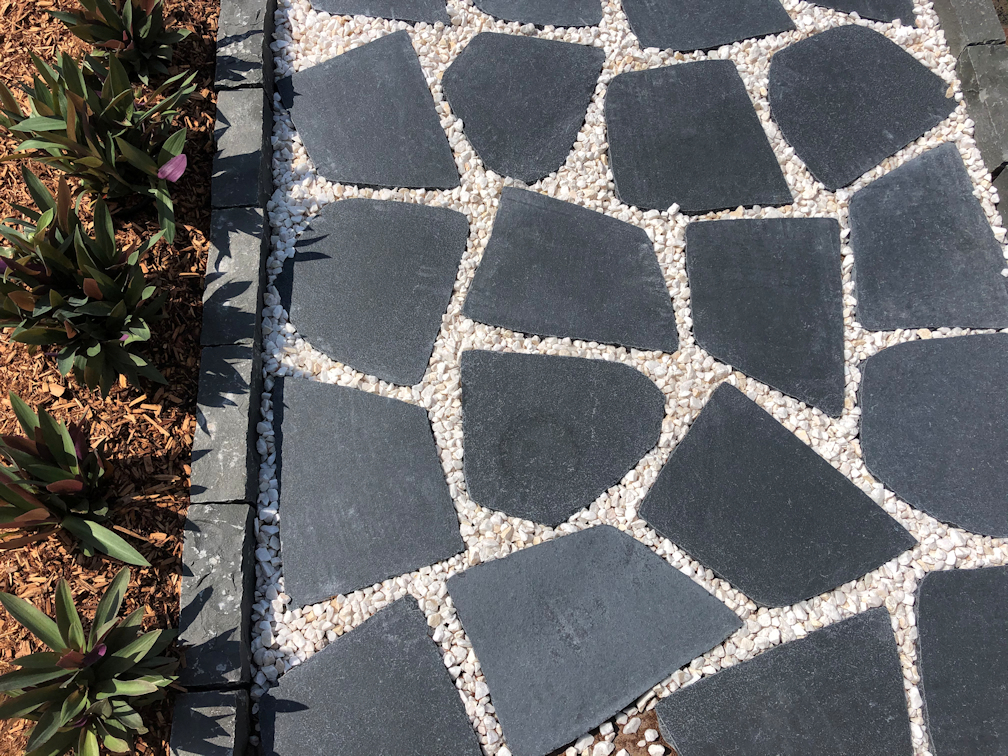 - Lay pavers and tap down level with rubber mallet. Leave a 3-5mm grout spacing.