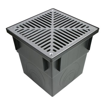 250mm rain water pit. Tough, durable and lightweight plastic. Templates on base for easy connection to 90mm pipe. Aluminium grate.